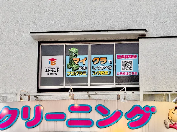 さいたま市見沼区 エドモンドプログラミングスクール東大宮校 窓サインさいたま市見沼区のエドモンドプログラミングスクール東大宮校様の窓に貼るシートをデザインさせていただきました。クリーパーが飛び出したデザインになっており、たのしく学べるワクワク感を演出しています。QRコードも向かいの道から読み込めます!#看板